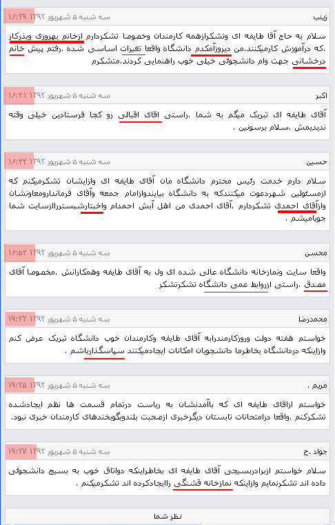 8 - در قسمت نظرات به خنده های بیمورد کارمندان قبل از ریاست اعجاب انگیز ! آقای طایفه اشاره شده است . کارمندان که عوض نشده اند. اینها همان کارمندان هستند و اگر آنروز میخندیدند کار بدی می کردند. آیا کارمندان دانشگاه هیچ بویی از ادب و تربیت نبرده بودند که به دانشجوها بطور بی مورد می خندیدند و آقای طایفه آمد و اینها را اصلاح کرد ؟
