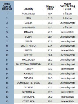 لحاظ شاخص فلاکت یا Misery index کشور ونزوئلا با رقم ۷۹.۴ واحد در رأس