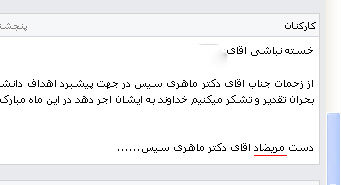 در نهایت اینکه کلمه ی دست مریضاد احتمالا باید آرزوی مرض برای کسی باشد ، چون در تمام لغتنامه ها این کلمه "دست مریزاد" است . اگر واقعا کارکنان دانشگاه این نظر را نوشته باشند که باید به رئیس دانشگاه و روابط عمومی ! تبریک گفت و متعاقبا کارکنان دانشگاه را اخراج و ساختمان دانشگاه جامع !!!! را به شهرداری سپرد تا تغییر کاربری دهد و بفروشد و هزینه ی آبیاری درختان نماید ! یا در وقت اضافی برای کارکنان کلاس جبرانی ادبیات گذاشت . چون از این نهاد انتظار بیسوادی نمی رود ! ..... که نیست ! دانشگاه است مثلا ! آنهم از نوع جامعش !