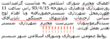 اما در این میان ، ارسال تعداد زیادی پیامک از طرف شهرداری شبستر برای من خیلی جالب بود . یک لحظه فکر کردم اگر شهرداری تهران برای خالی کردن هر سطل آشغال به شهروندان اس! میداد چه قیامتی می شد ! براستی هدف چیست ؟ ضمنا هزینه این پیامک ها از کجا و با اجازه چه مرجعی برداشت می شود و ضرورت این کار در چیست ؟